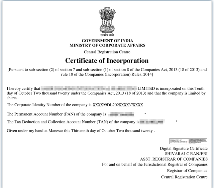 After successful verification by the Ministry of Corporate Affairs (MCA), the following documents are issued: