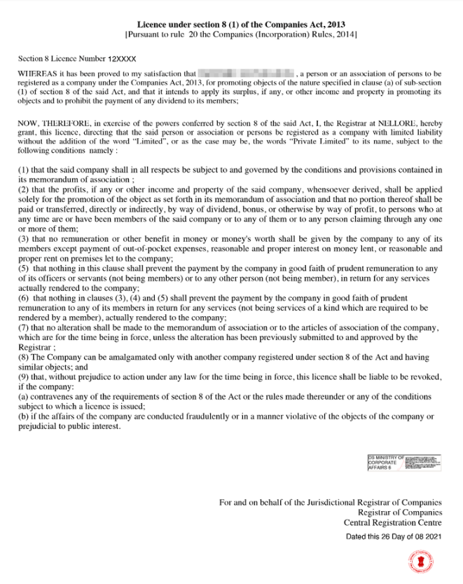 A Section 8 Company must comply with the Companies Act, 2013. Failure to follow the law or act within its objectives can put a Section 8 Company’s license at risk.